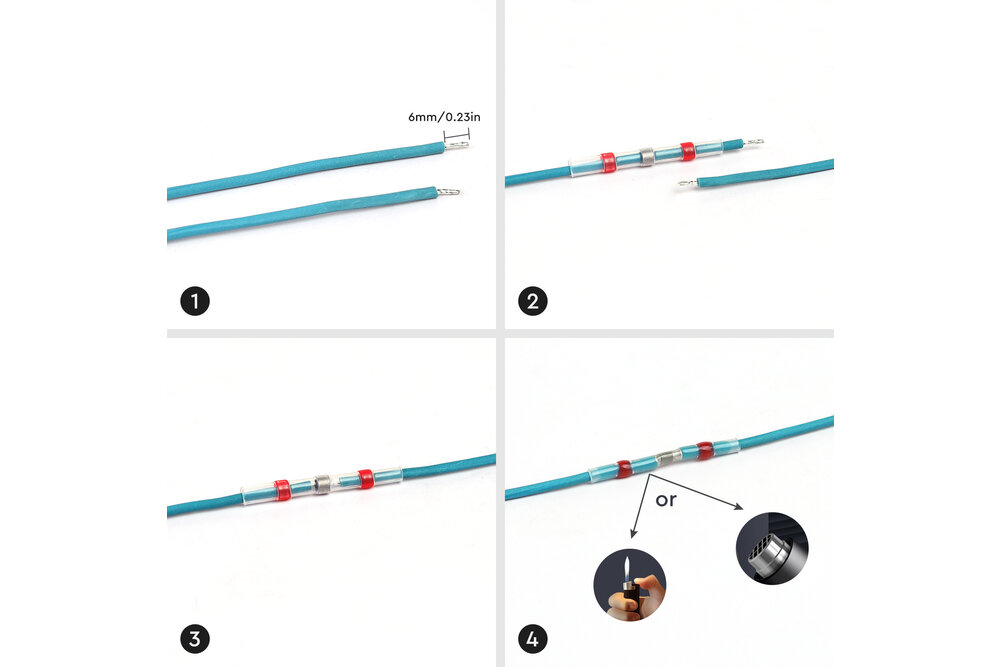 Waterdichte krimpkousjes met soldeer ring: Ook worden er waterdichte krimpkousjes met inwendige soldeer ring meegeleverd om de verbinding tussen uw ledstrip en de driver waterdicht te maken! Met slechts een vlammetje van een aansteker kunt u een sterke en waterdichte verbinding maken. Zie de afbeeldingen voor een voorbeeld.