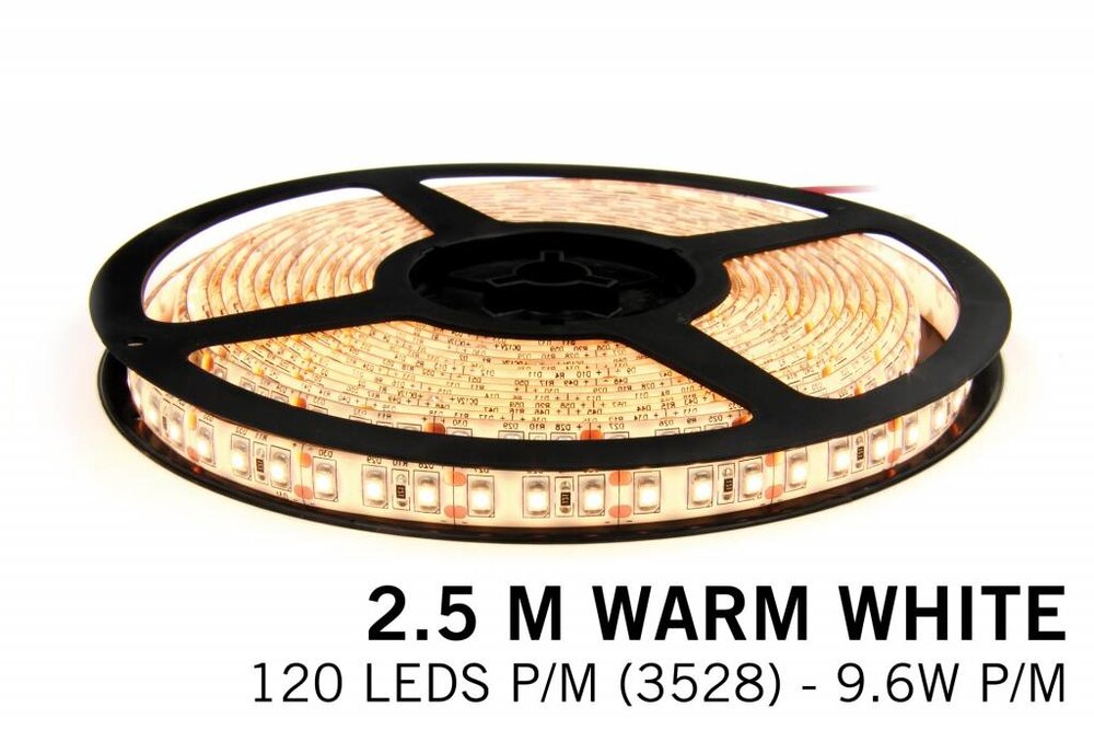 Losse Warm Witte led strip van 2,5 meter lang met 120 heldere type 2835 led's per meter. A-klasse leds met een totaal vermogen van 24 Watt. Kleurtemperatuur van 2700K. 12 Volt, Ideaal voor koof of sterkere accentverlichting..